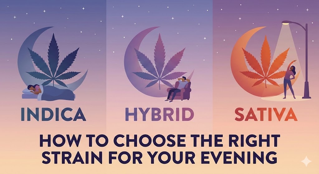 Indica, sativa, and hybrid are useful labels, but they’re just the starting point. Your ideal evening strain depends on your goals, your body, and what kind of night you’re having.